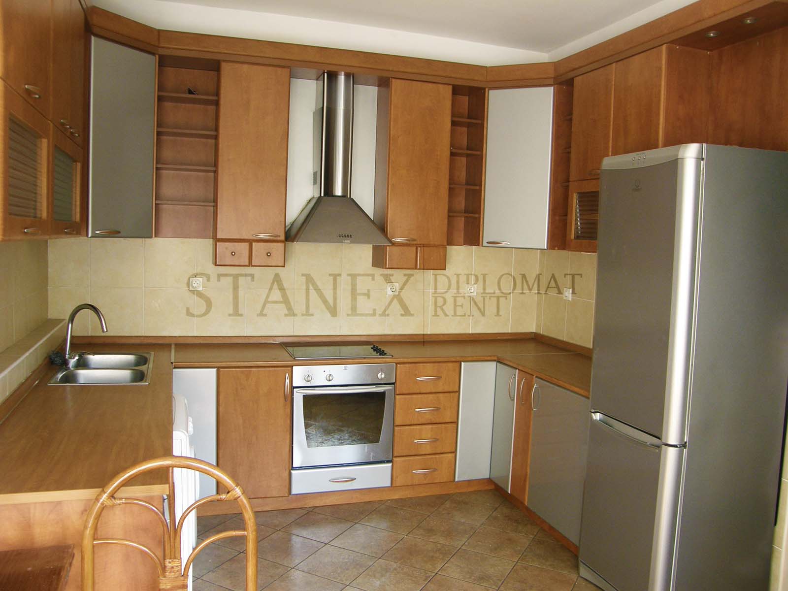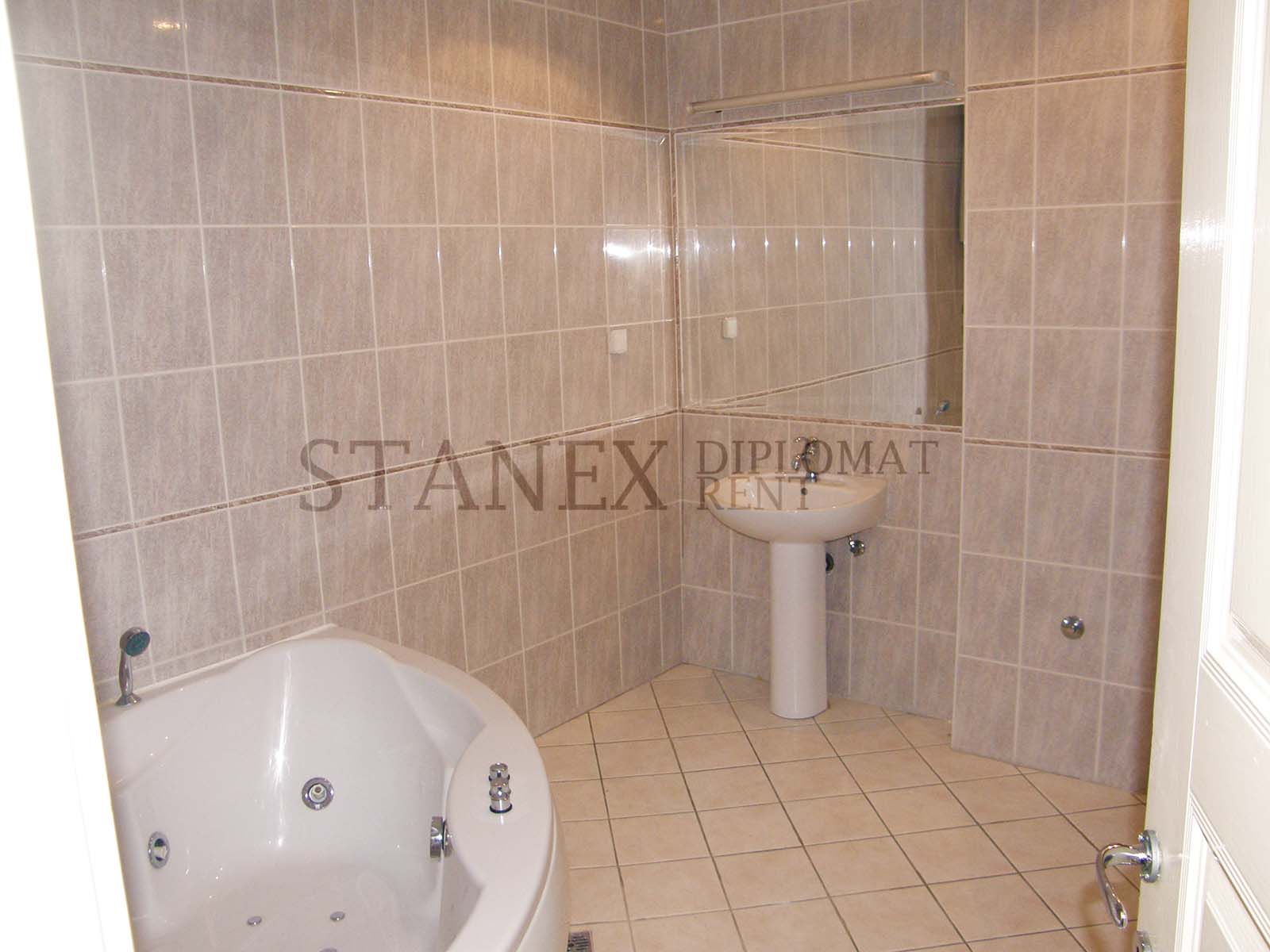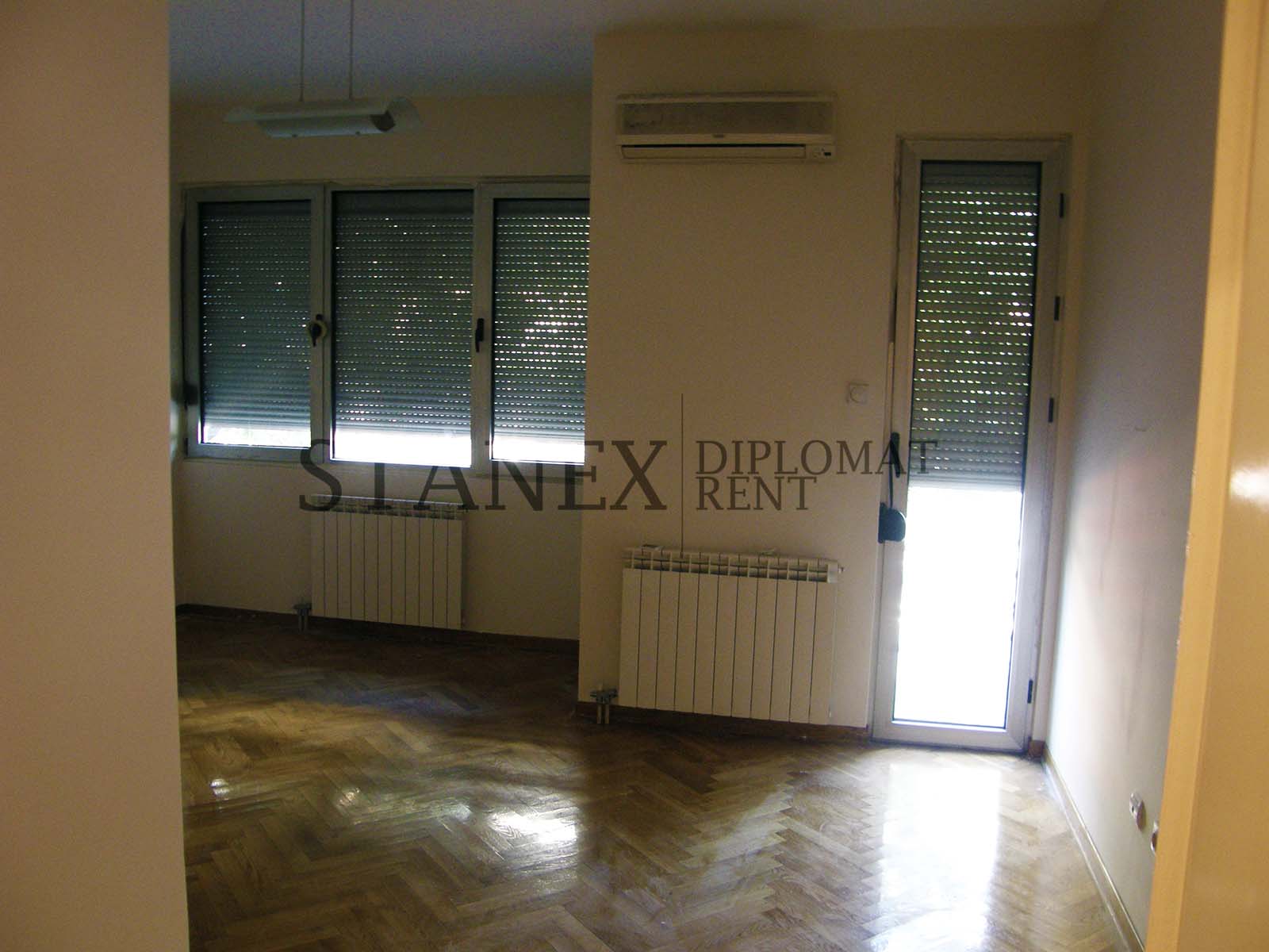 An unfurnished, huge modern apartment located at the Center and placed on the first floor. It has three bedrooms, two bathrooms and comes with a garage/parking space. It includes air condition and city heating.