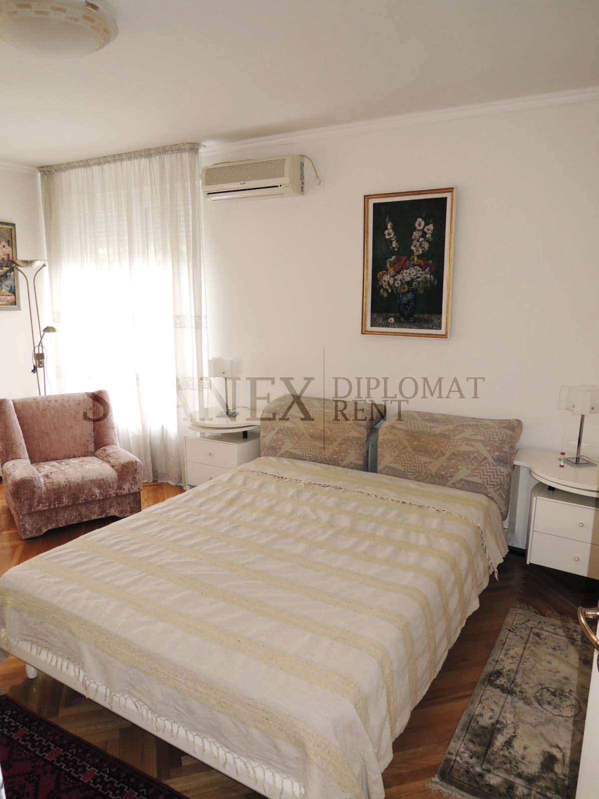 A spacious, fully furnished elegant apartment located at Vracar that featured four rooms, and three bedrooms as well as two bathrooms; an open concept dining and living area, with gorgeous hardwood floors. It’s placed on the 5th floor and does include a garage space.